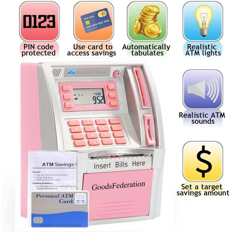 - 💰🎁🎄【PIN Code Re-Setting】--PIN code makes your 'property' more secured,easy to change the code to another one.If you forget your password,simply press the RESET button at the back of the ATM piggy bank,the codes will return to 0000.Perfect toy for teaching your boy or girl the value of money in a fun way, making this money bank a great educational toy.