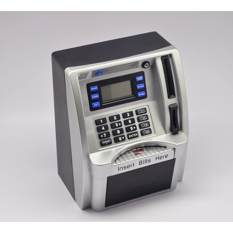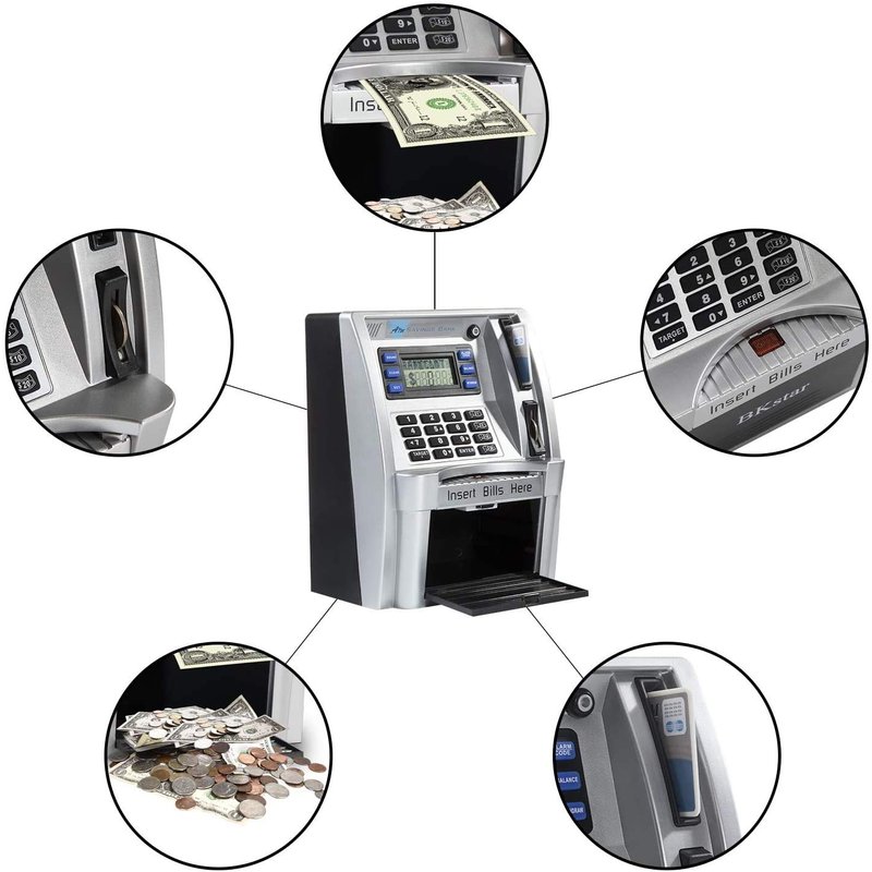 - ATM Piggy Bank Targets Setting--press balance key to check your balance,press target key,children could check the LCD display to see the amount that is still needed to reach their goals.An interesting way to teach your boys or girls how to save money and track their savings. Kids atm machine also features time clock with 12/24 hour format and alarm,calendar and savings target setting.
