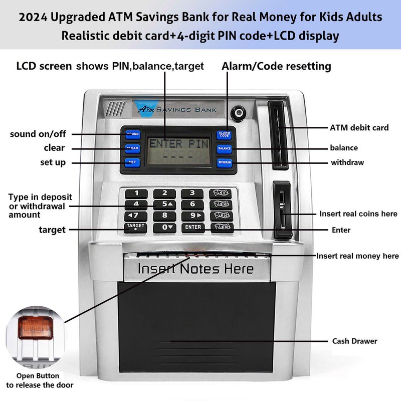 2024 Upgraded ATM Saving Piggy Bank for Real Money for Kids Adults Personal ATM Savings Bank Machine with Card, Password Login, Coin Recognition, Bill Feeder, Balance Calculator, Electronic Safe Box