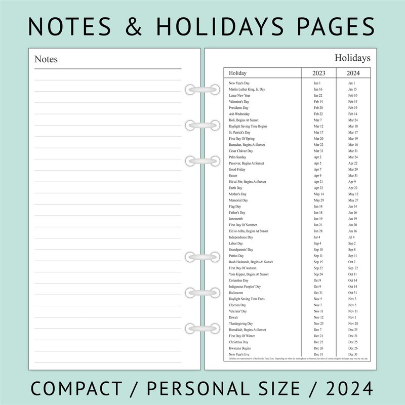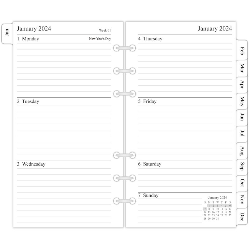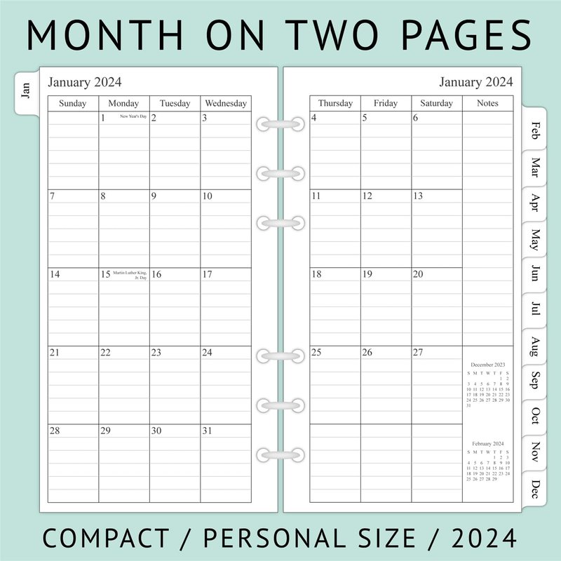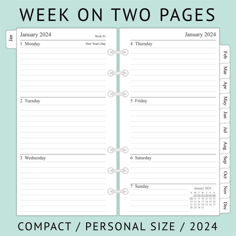 Refill your personal size planner and keep organized with the 2024 year two-page per weekly refills that feature monthly tabs, notes section, contact and holidays pages.