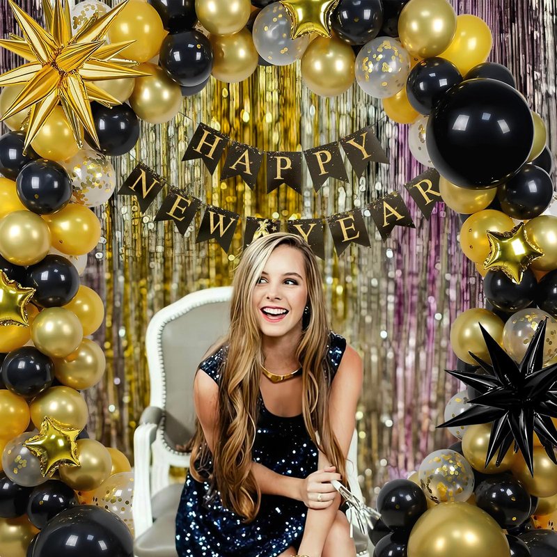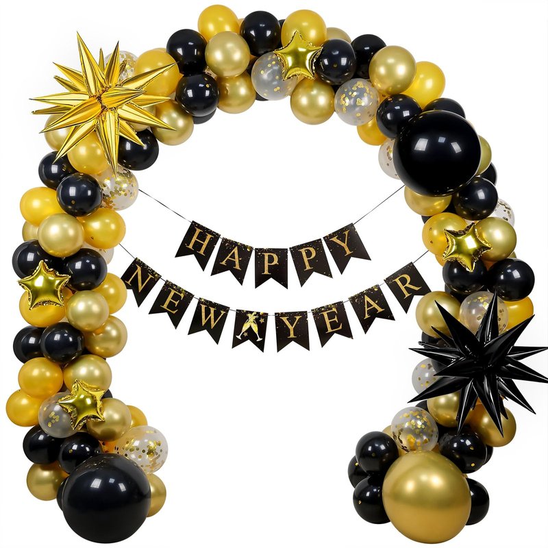 - 2025 New Years Decorations Set -- You will get 1 set HAPPY NEW YEAR banner, 2pcs 22" gold/black stars foil balloon, 4pcs 10" gold stars foil balloons, 3pcs 18" latex balloons, 90pcs 10" latex balloons, 10pcs 12" gold confetti balloons, 1 roll glue, 1 roll 16ft balloon tape. Enough decorations quantity to create a wonderful 2025 New Years Eve Party!