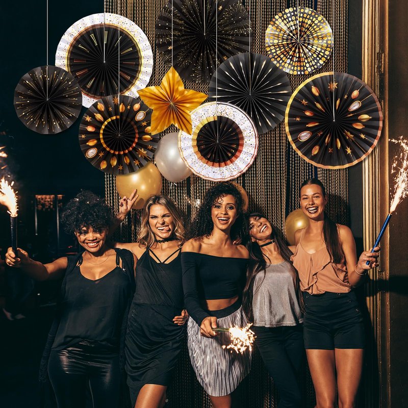 - Elegant Black & Gold Theme – Celebrate the 2025 New Year in style with these stunning black and gold paper decorations, including paper fans, star designs, and pinwheels, perfect for creating a chic and festive atmosphere at your New Year's Eve party.