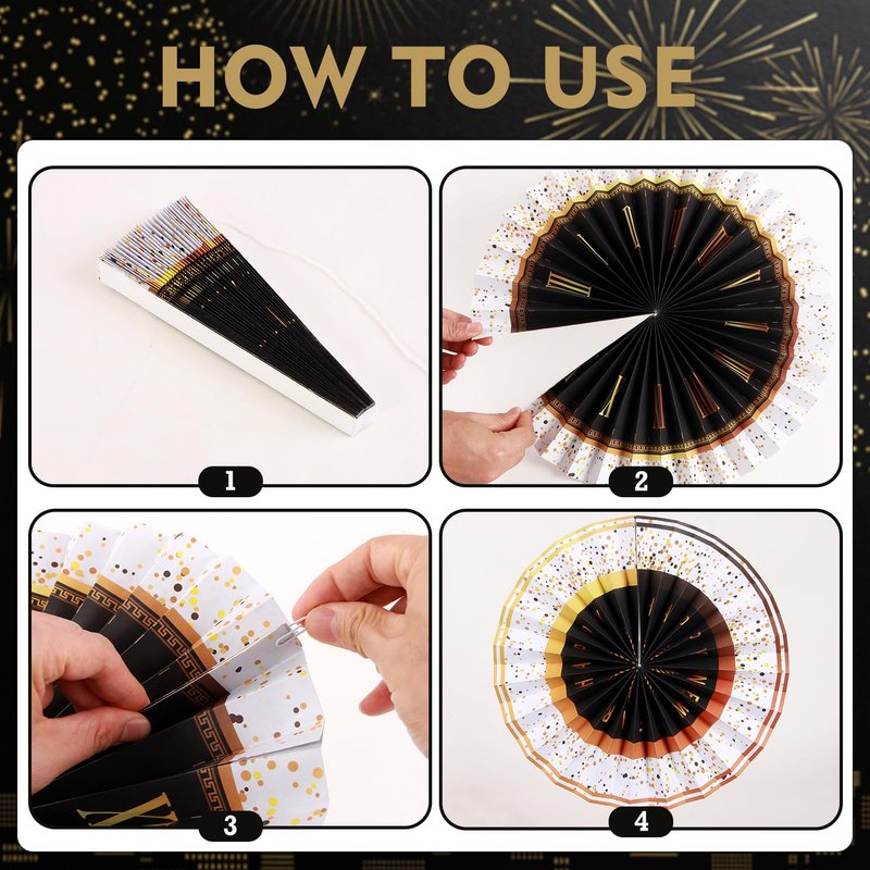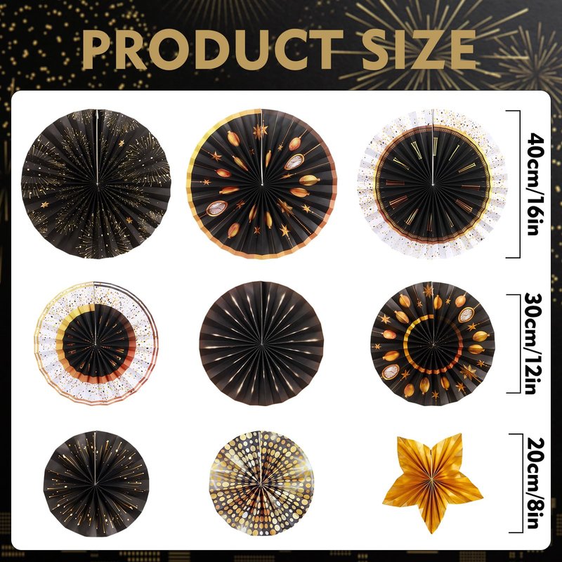 - Complete Set for a Stunning Decor – This set includes a variety of paper fan sizes, star-patterned accents, and rotating pinwheels, giving you a versatile range of options to create a beautiful and festive decor scheme for your New Year's celebration.