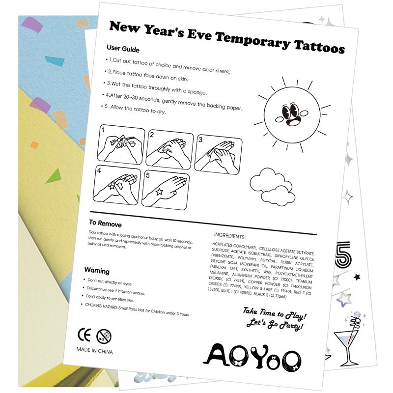 - Exclusive Design: Two sheets with a total of 40 colored + metallic tattoos. And the NYE tattoos featuring unique designs of Cheers to a New Year, New Year New Me, Happy New Year designs that you will love.