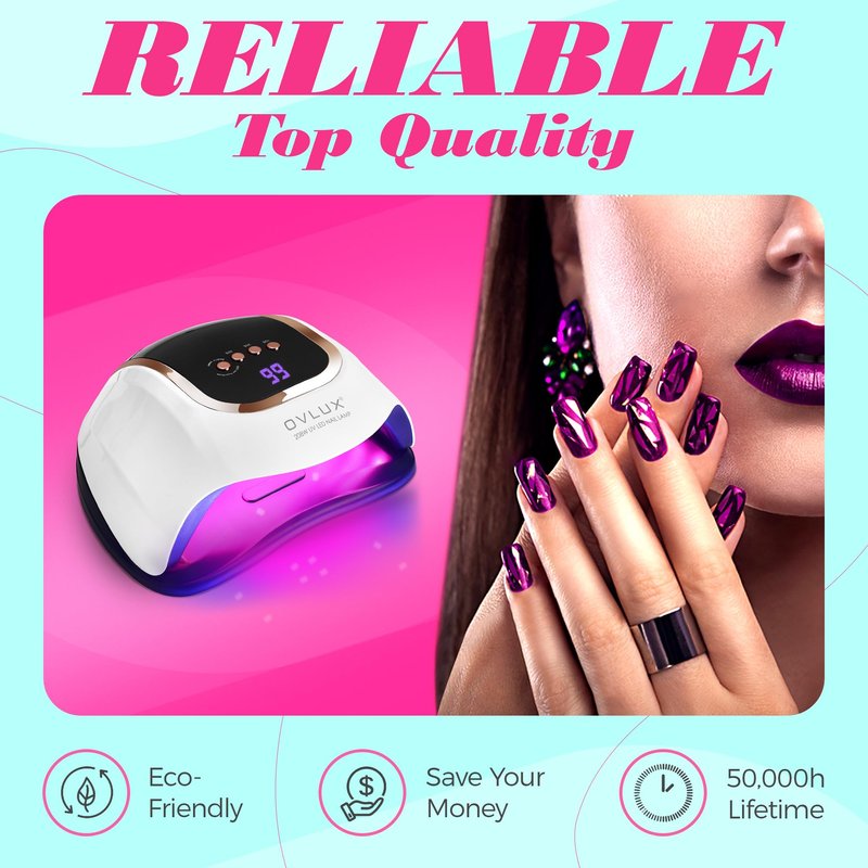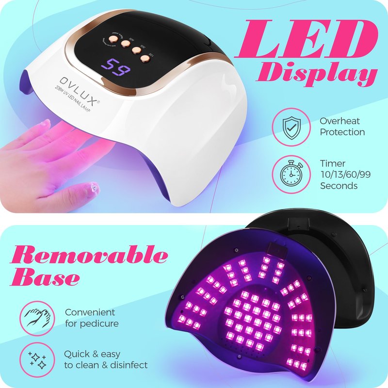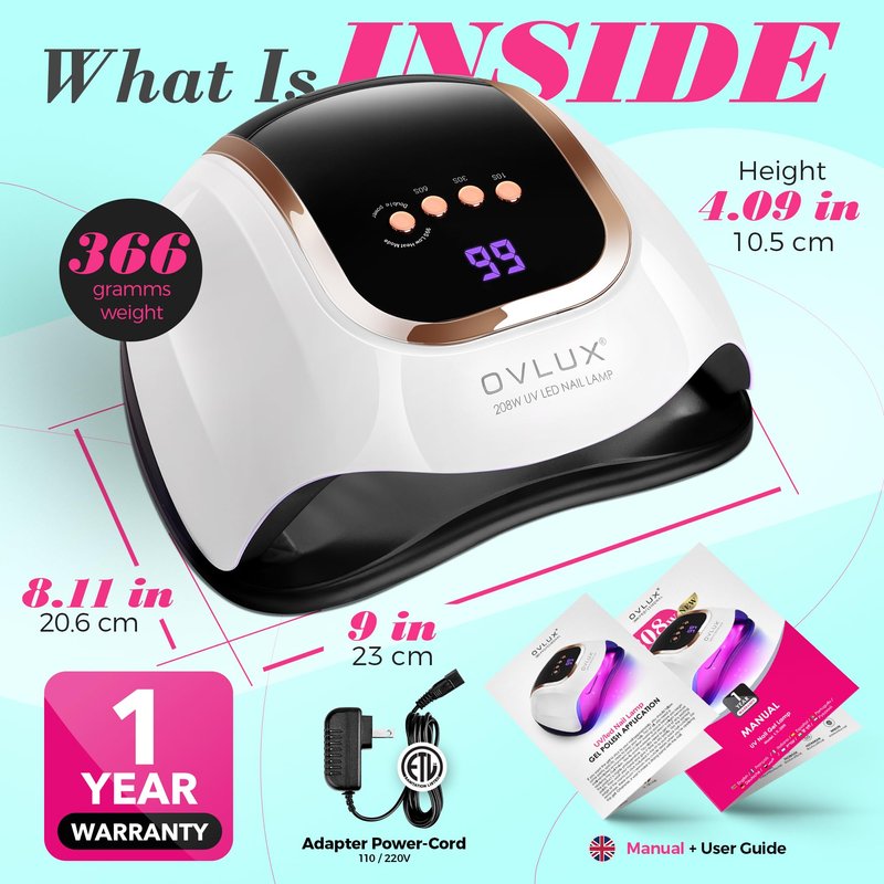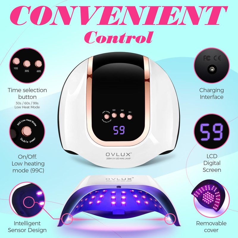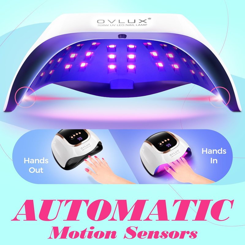 - Superior 208W Power & 66 LED Array: Experience unmatched efficiency with our OVLUX UV LED Nail Lamp, boasting a formidable 208W power and equipped with 66 strategically placed LED lights. This setup ensures a rapid, uniform curing process for all types of gel nail polishes and extensions.