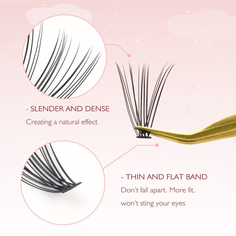 - Easy To Use: Applying the cluster lashes underneath your natural lashes, you can barely feel the clusters. Our cluster lashes with flat base blend seamlessly into the lash line, providing an ultra-comfortable wear that is barely noticeable. The lash band portion does not sting your eyelid area when you blink, Giving you the perfect lash application experience.