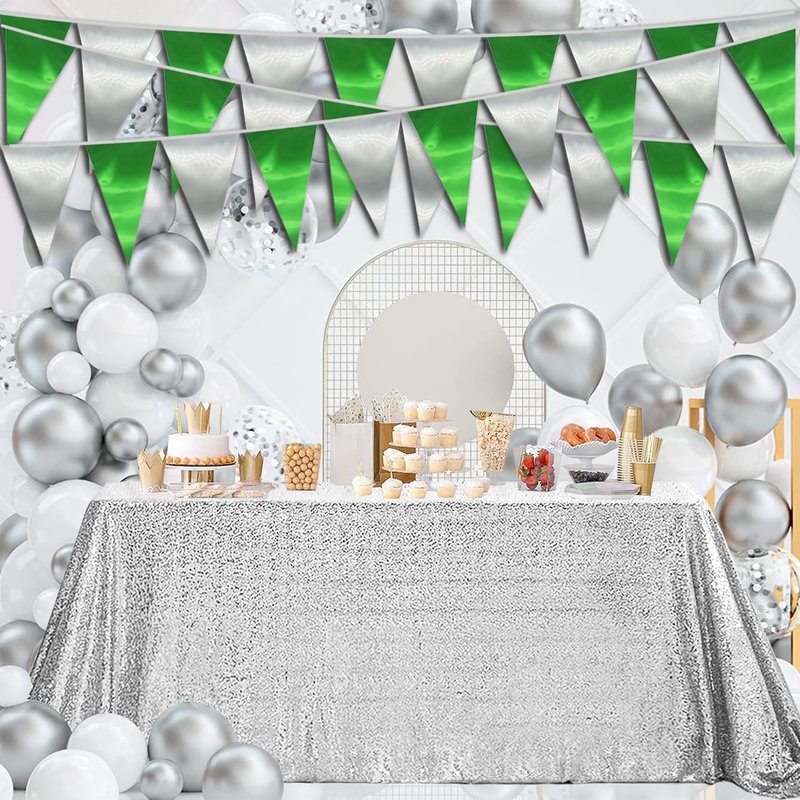 20M/65FT Green Silver Triangle Pennant Banner Flag Metallic Fabric Bunting Garland for Christmas Graduation Wedding Engagement Anniversary Bachelorette Birthday Bridal Shower Hen Party Supplies