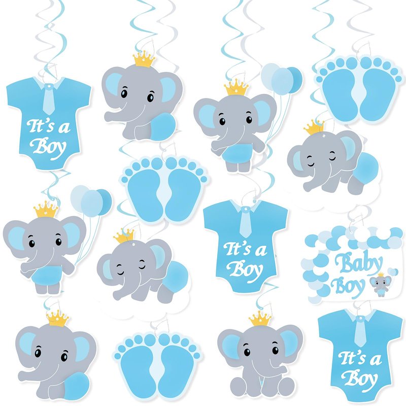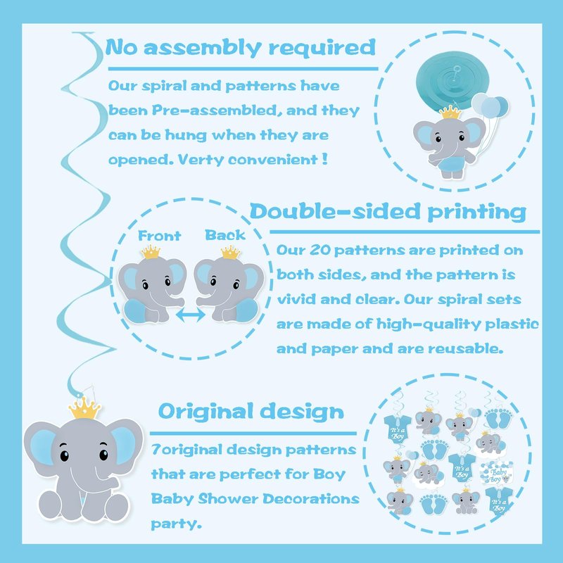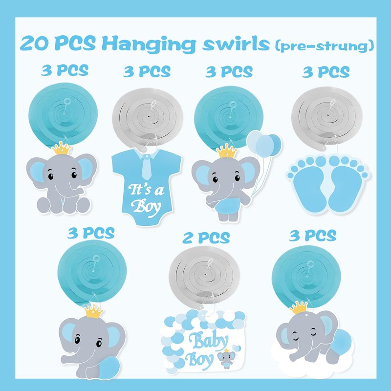 - 【JINGAOFUN Elephant Party Decorations for Boy 】 You will get Pre-strung 20 blue elephant hanging swirls with double-sided printing patterns. 7 original elephant design - 4 blue elephant, 1 blue clothes, 1 baby footprints, 1 blue balloon chain, boy or girl frame. Each elephant patterns has 2-3, and all is 20.