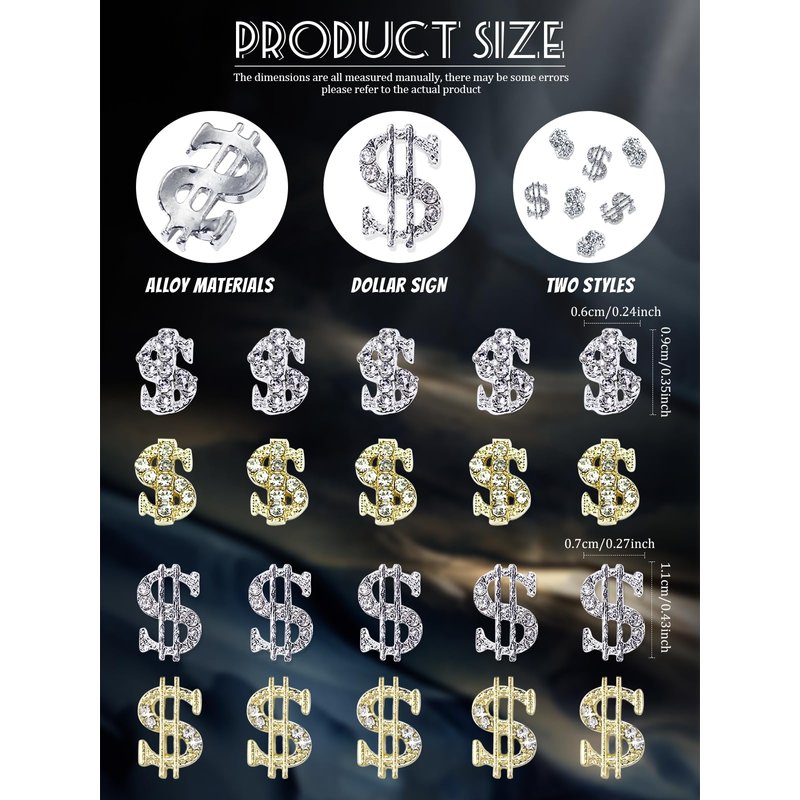 - 💰【Package Includes】You will receive 2 different styles of gold and silver dollar sign nail charms, 20 pieces in total. The sufficient quantity and rich styles can meet your DIY nail art needs.