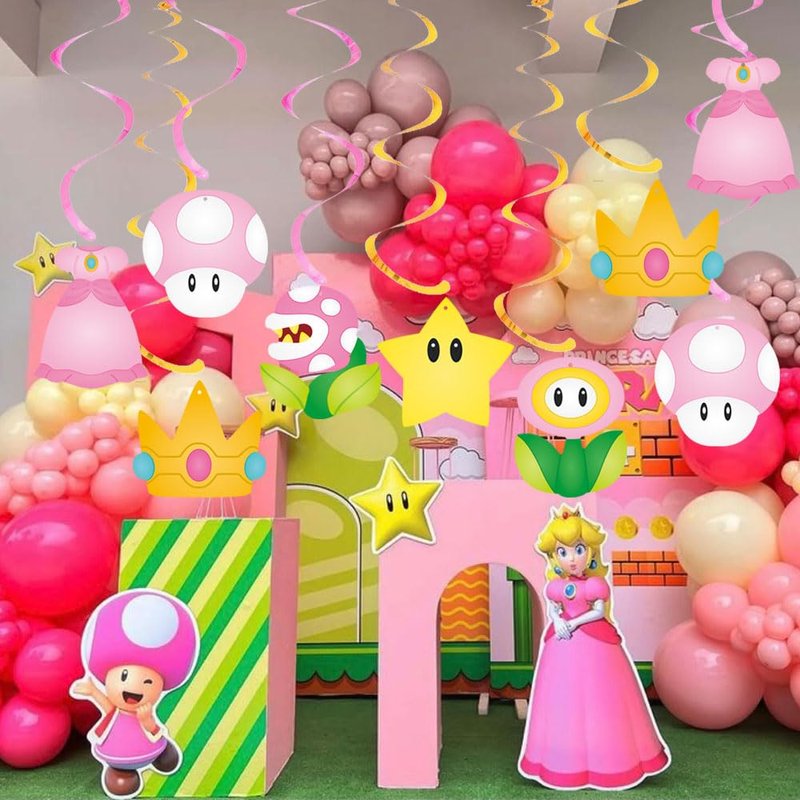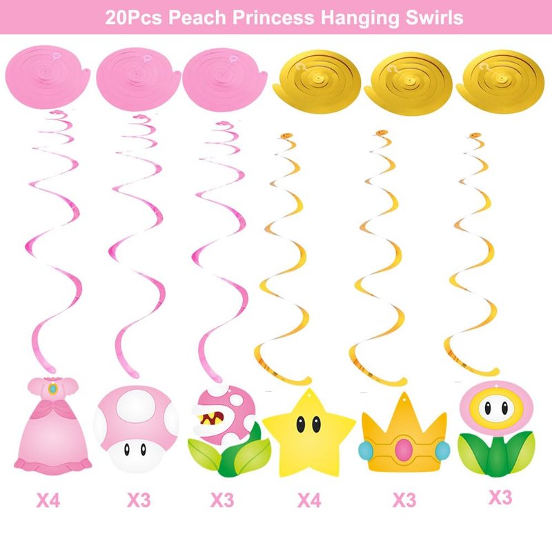 - 【Pink Princess Peach Hanging Swirls】Pink princess hanging swirls decorations Includes 20pcs hanging swirls, 20pcs princess peach theme cutout with corresponding 20pcs hanging swirls, plus 20pcs hooks. 6 different Princess dress, crowns, flower and other cartoon print card, the cute and colorful combination will provide your children feel novel and happy in the the princess peach theme party.