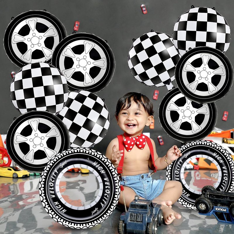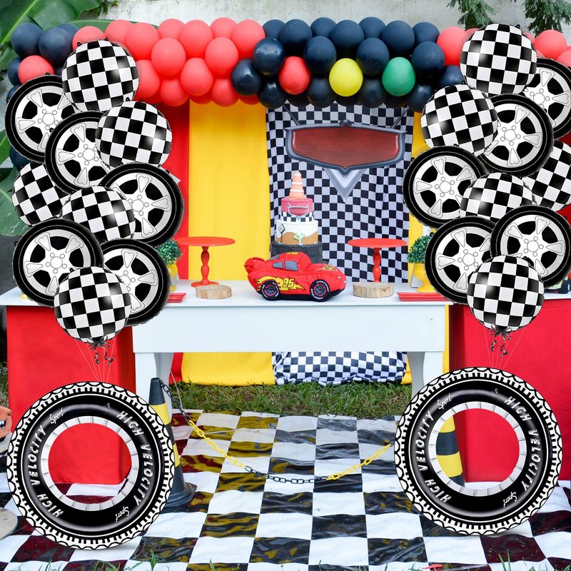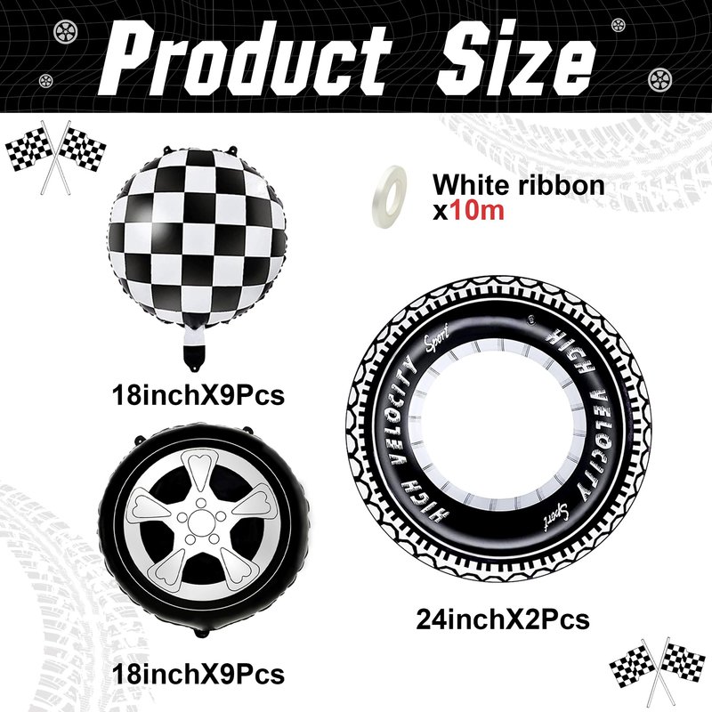 - Giant Tires;Classic Wheels and Checkered Balloons: The package comes with 2pcs large and thicken tire balloons with 24inch;9Pcs creative 18inch wheels pattern balloons;9Pcs classic checkered balloons.Quick to add a special vibe to any car themed celebration events.Your kids will fall in love with these car themed balloons if they are race car or monster truck enthusiast