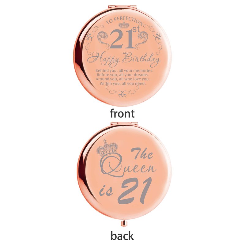 - 21st Birthday Makeup Mirror: The 21st Birthday Makeup Mirror front is engraved with lettering "To Perfection 21st HAPPY BIRTHDAY Behind you, all your memories. Before you, all your dreams. Around you, all who love you. Within you, all you need”. Back is engraved with "The Queen is 21”. It will bring back amazing memories when 21st Birthday Gifts for Women uses it every time.