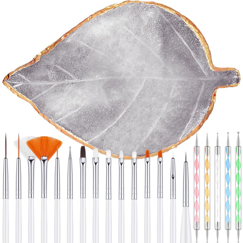 - nail design tools kit: this kit contains 1 piece leaf shape resin palette with golden edge, 15 pieces handle brushes, 5 pieces nail dotting pens, a convenient set for you to make your own nail design styles, suitable to hold many colors and pigments you want to mix, enough to meet your basic using needs