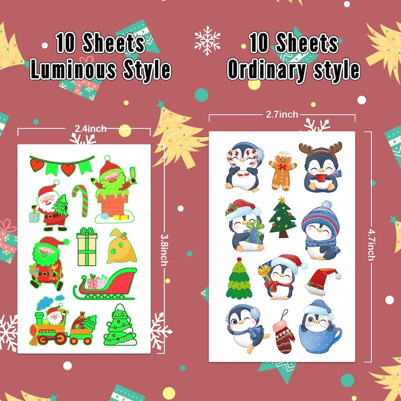 - 216 Styles Temporary Tattoo Christmas: Kids Tattoos Temporary Stickers include 10 sheet ordinary stickers and 10 sheet luminous stickers, which can meet the needs of different people and enough quantity for Christmas party. Luminous temporary tattoos can create warm and unique atmosphere, making kids happy.