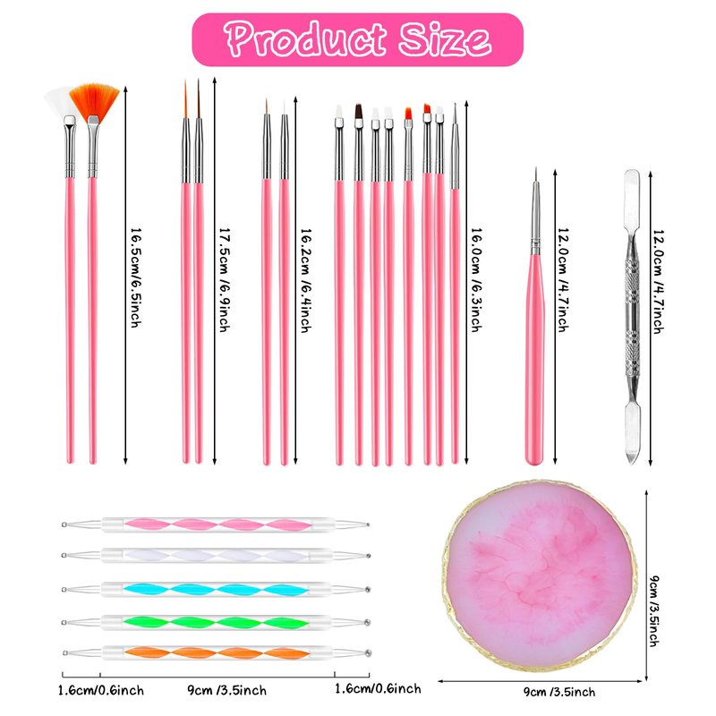 Quantity: 1 resin palette, 5 dotting pens, 15 nail brushes,1 Cosmetic Makeup Spatula Stirring Rod