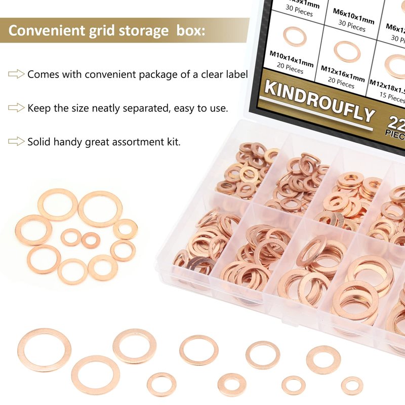 - √【Multi-functional Storage Box】: All Kindroufly 225 pieces 10 sizes copper sealing flat washers are packed in a solid transparent storage box. We put 10 sizes copper washers in 10 grids, each size are marked with a clear label. It is very convenient for you to choose size, easy to carry and store, which can save your time and energy.