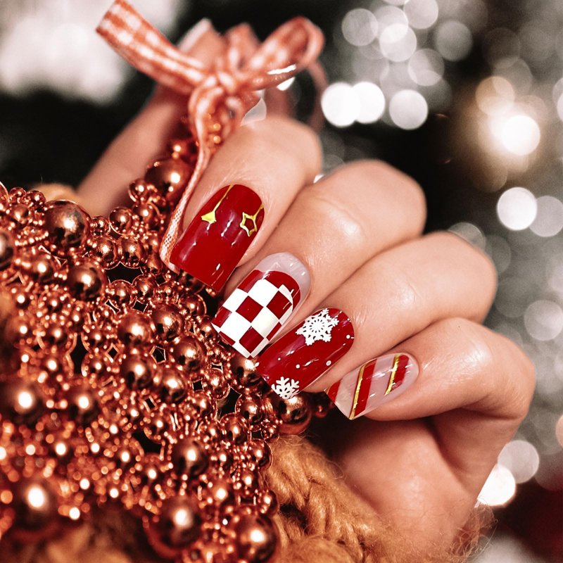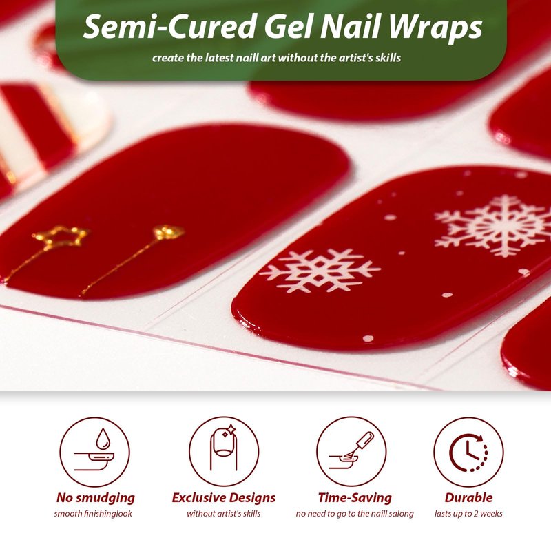 - 【Christmas Design】Our semi cured gel nail strips are designed with white snowflakes and gold strips on red surface,full of winter holiday vibe