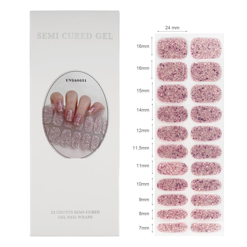 22pcs Semi Cured Gel Nails Strips Tips UV Nail Stickers Polish Wraps-Works with UV Nail Lamp Light, 2 Prep Pads Nail File Wooden Stickers DIY Manicure Easy to Apply&Remove (051 Shine Pink)