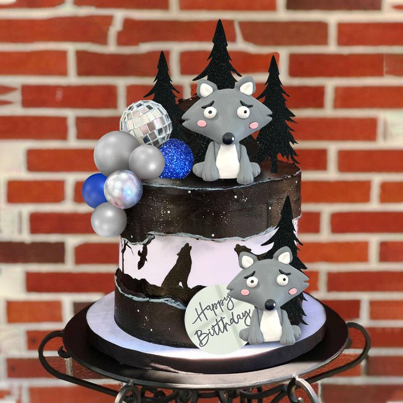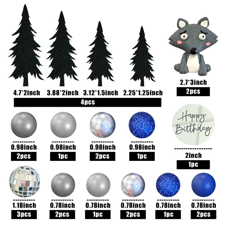 - Package Included: 2 x wolf cake toppers, 4 x tree cake toppers, 2 x disco ball cake toppers, 6 x gray ball cake toppers, 4 x silvery ball cake toppers, 4 x blue ball cake toppers, 1 x acrylic happy birthday cake topper. The specific dimensions are shown in the drawing.
