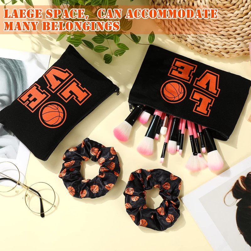 24 Basketball Stuff Set Cosmetic Bags Sport Makeup Bags Pencil Case Portable Storage Case Satin Sport Hair Scrunchies Elastic Hair Bands Basketball Gifts Basketball Accessories for Girl (Black, Love)