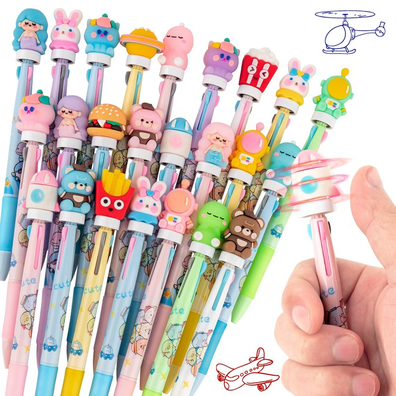 【24 Fidget Spinner Multicolor Pen Set】- This set of 24 multicolor fidget pens combines vibrant colors with a creative stress-relief design. Each pen comes with red, black, and blue ink, and is adorned with various cartoon designs such as mermaids, dinosaurs, hamburgers, bears, rabbits, rockets, and astronauts. A simple spin adds an element of surprise and fun to every use.