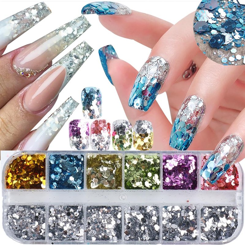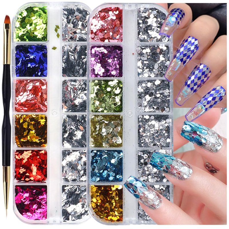 - You Will Get:1 Box 12 grids 3D mirror gradient hexagon nail glitter sequins;1 Box 12 grids sparkly gradient rhombus glitter nail art flakes;1 Pcs Two-headed nail pen. Glitter adopting special laser technology, these shiny sequins exhibit different shining effects from different angles.