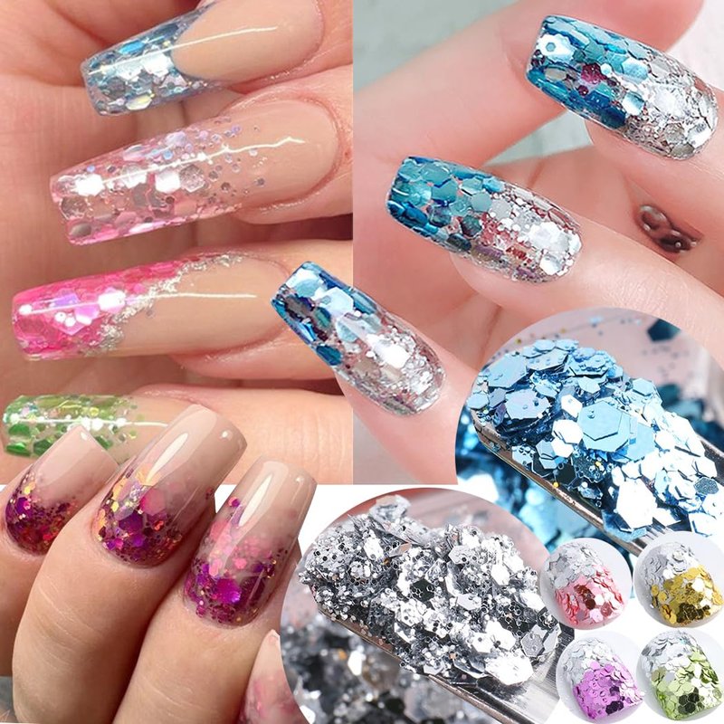 - Hexagon Mermaid Manicure: Quantity: 12, color: 6 silver, 6 colorful, shiny sequins developed a new style-mermaid manicure, like the mermaid tail sparkling exquisite modeling. The two-color sequins are placed on the surface of the armour one piece at a time to create the effect of a mermaid tail.