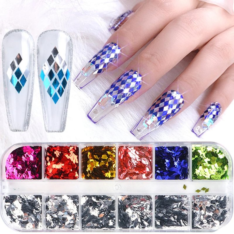 - Rhombus Sequined Manicure:Quantity: 12 cases, color: 6 cases of silver, 6 cases of color, two-color matching to facilitate your design gradient effect of the mirror, the use of color overlay will have a different effect, diamond-shaped sequins nail, light from the word, we all feel a kind of shiny feeling, and then you will find its characteristics!