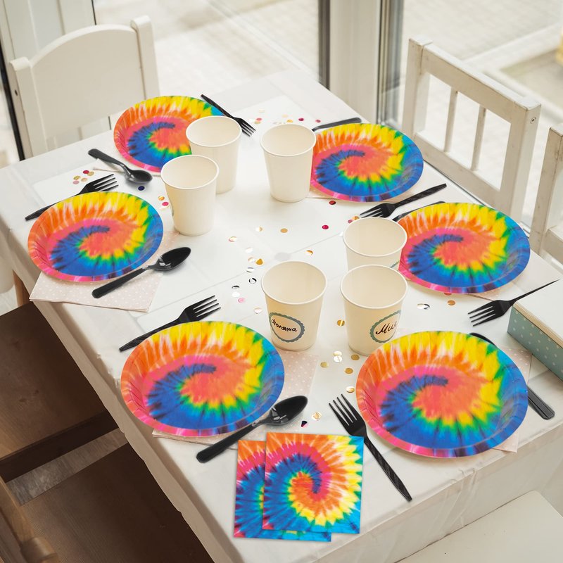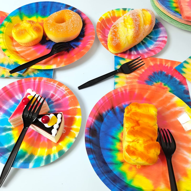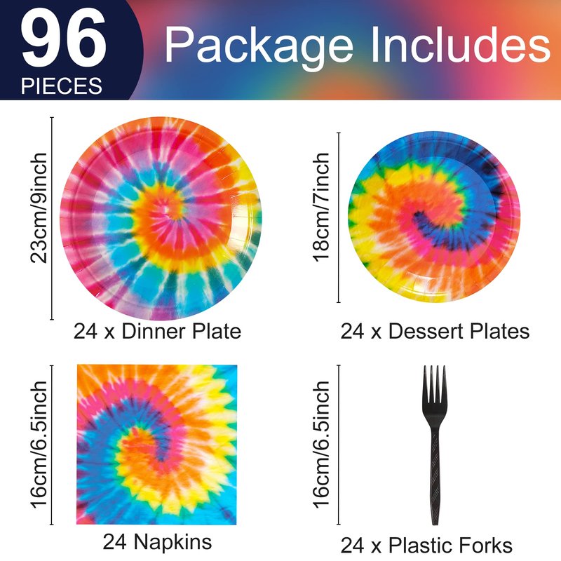- Package includes: You will get 24pcs of 9in Tie Dye party paper plates, 24pcs of 7in Tie Dye party paper plates, 24pcs of 6.5in napkins and 24pcs of plastic forks, each set can hold 24 guests.