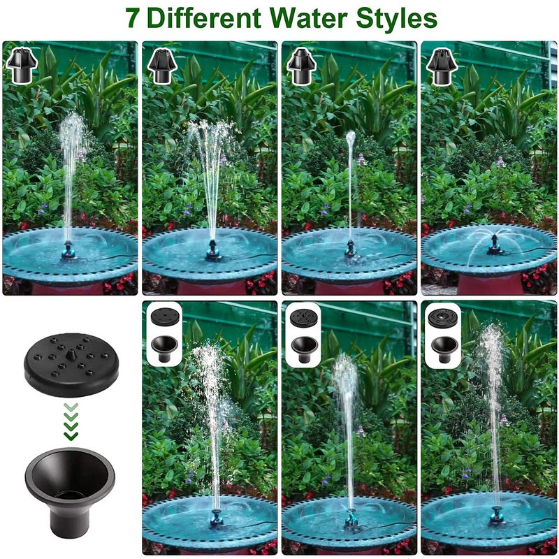 - 6 Colorful LED Lights Water Fountain Pump: The fountain pump is equipped with 6 high-brightness LED lights, so that your garden can become colorful during the day and night; The RGB color automatic cycle setting makes the night in your yard more romantic and beautiful; And with 7 nozzles, there are 7 different fountain modes, you can easily disassemble and replace