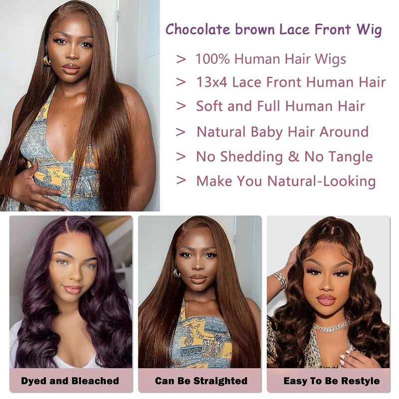 【Brown Lace Front Wigs Human Hair Material】:Unprocessed Virgin Human Hair Wigs ,10A Grade Brazilian Virgin Human Hair for Black Women,White Women,Cut From Young Girl,Soft and Clean ,Comfortable and Silky.Glueless Lace Front Wigs Human Hair,Fully Human Hair,Without Any Synthetic and Animal Hair Mixed. 【Brown Straight Wigs Human Hair Pre Plucked 】Ombre Lace Front Wig Human Hair,13X4 Free Part Can Make Any Style As You Want .Lace Front Wig With Pre Plucked Baby Hair. 【Brown Straight Wigs Human Hair Lace】:Lace Front Wigs Human Hair Colored,Transparent Lace Can Melt Into Any Skins,This Lace is More Thin and Undetectable Can Blend with Anyone’s Skin Tone Who Wears the Wig , Comfortable Against Skin. and it's Beginner Friendly. 【Brown Straight Wigs Human Hair Cap Details】: 13x4 Chocolate Brown Lace Frontal Wig,16-28 Inch Available in Stock, 150% Density Brazilian Lace Frontal Closure Wigs Human Hair. Medium cap size(22 inch - 22.5 inch), with 4 Combs and Adjustable Straps Make it Fit Most People and Easier to Install and Wear. 【Hair Suitable Scene】:You Can Wear It in Any Occasions, Such As Christmas, New Year, Holiday, Theme Parties, Weddings, Dating, Cosplay, 150% Density Human Hair Wigs For Women.