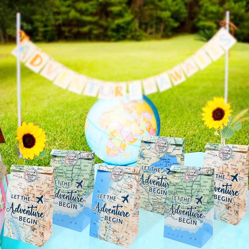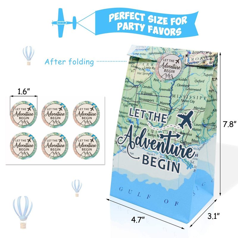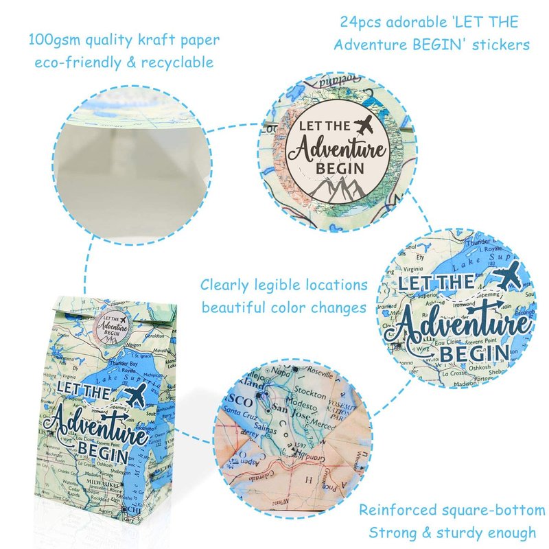 - ✈️ ADVENTURE AWAITS PARTY SUPPLIES:Package includes 24 pcs DOUBLE-SIDED Paper-Made goodies bags(4 designs) and 24 pcs"LET THE Adventure BEGIN"stickers,featuring map backgrounds.