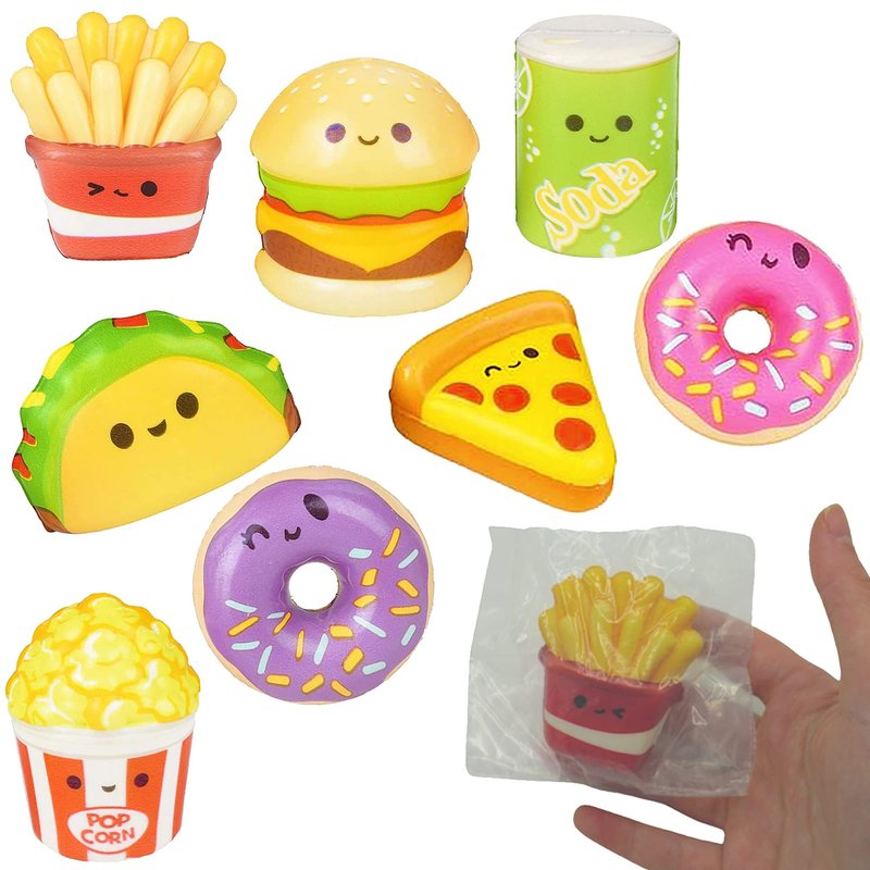 - FAST FOOD SQUISHY - 8 Designs - Taco, Hamburger, French Fries, Popcorn, Pizza, Can of Soda, 2 Donuts Kawaii squishy