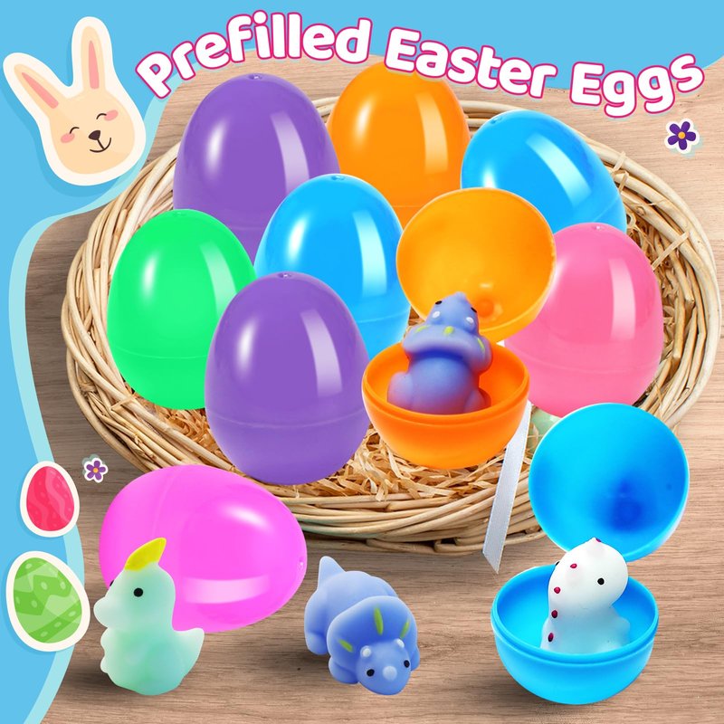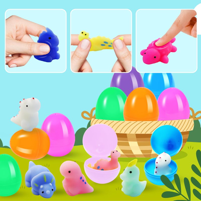 - Prefilled Easter Eggs Toy Set:Filled Easter eggs kit includes 24 pre-filled easter eggs with 24 pcs dinosaur squishy toy. Squishy toys are light in weight,easy to carry anywhere,feel relaxed and fun when you touch it,reusable, allowing consistent squishing, stretching, and playing. The helps kid make new friends in group and party activities. Easter fidgets toys are going to be a hit in the kids Easter baskets!