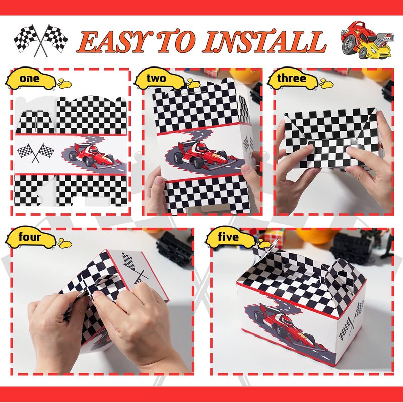 - Cool Car Design: race black and white treat boxes are designed with 4 different racing cars in the middle of the pattern, which are nice party favors for any theme party, showing the racing spirit