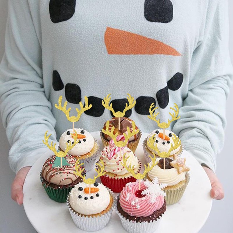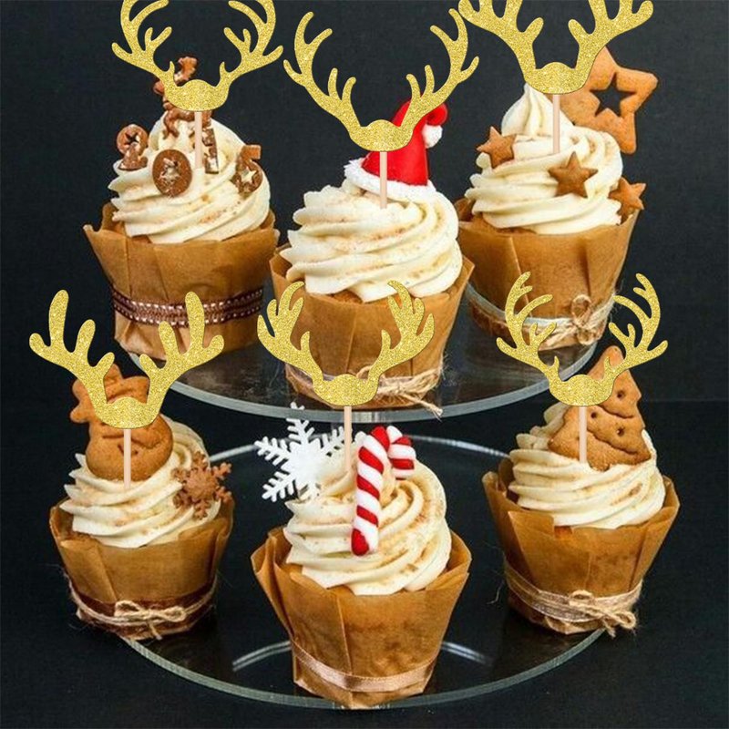 Christmas Deer Antler Cupcake Toppers for Baby Shower Wedding Hunting Rustic Birthday Christmas Theme Party Cake Decorations Supplies