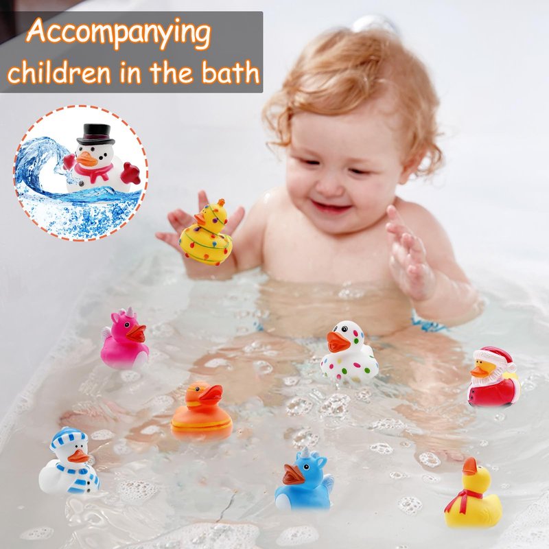 - 🎄【Fun Bath Toys】Our Christmas Bath Toys are Rich Style,Squeezing the Duck with Hands Will Make a Squeak. When children splash and play in the water, it's a great exercise for motor skills and hand-eye coordination, and it's also great for sensory exploration!