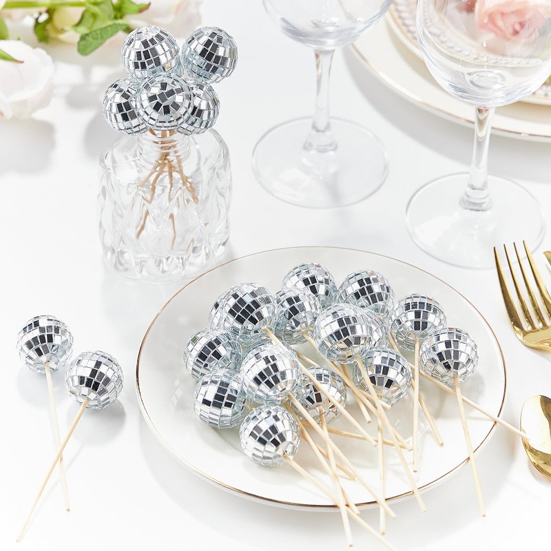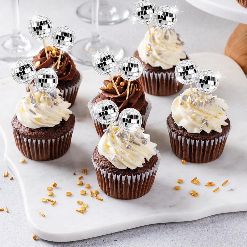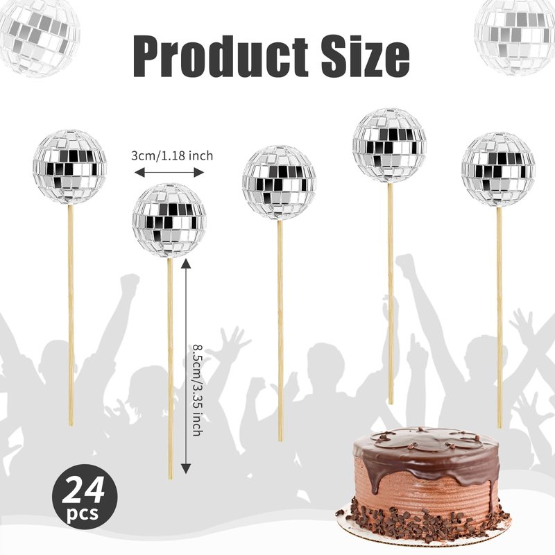 The package contains 24 pieces of disco ball cupcake toppers, which measure 1.18 inches in diameter.