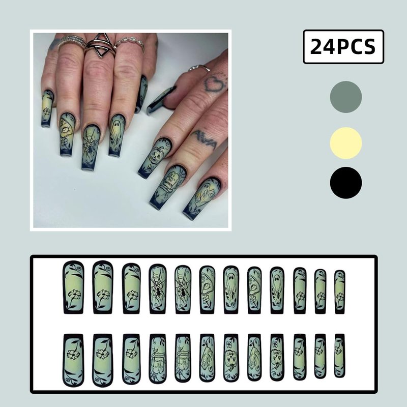 24 Pcs Halloween Spuare Press on Nails Long Coffin - SHANRUN Matte Green French Fake Nails Press ons Nail Art Tips Glue on Nails Full Cover Acrylic False Nails with Ghost Tombstone Comics Design