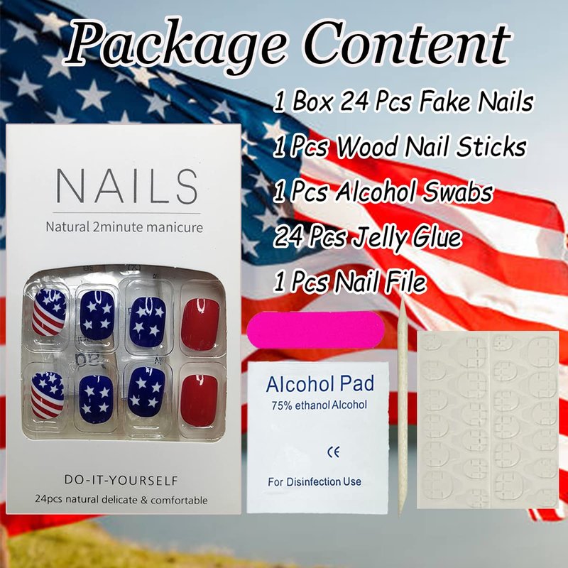 - 【Package Contents】24 Pcs Patriotic Press on Nails +1 Nail File + 24 Pcs Jelly Glue Stickers+1 Alcohol Cotton+1 Wooden Stick.(Durability of jelly glue is not as good as liquid glue, but it makes fake nails reusable. Please use suitable glue according to different scenes)