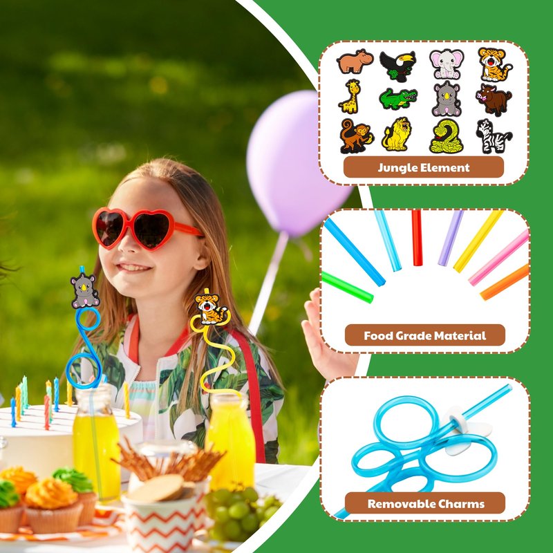 - Cute Jungle Themed Party Supplies: Kids of all ages love such Jungle, especially girls aged 3 to 10 years old. Perfect for kids' birthdays or if you’re just trying to get your child to drink more water.These straws are easy to use, with a DIY design that lets you adjust the cartoon patterns to your liking - no glue or tools required. Mix and match the patterns and straw colors to create unique drinks or distinguish between different groups of partygoers.