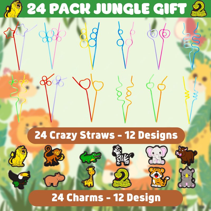 - THE PERFECT Jungle THEMED PARTY GIFT: Our birthday supplies set INCLUDES 24 SET Jungle Reusable Crazy Straws Drinking Silly Straws (With 24 different vivid charm designs) + 2PCS STRAW CLEANING BRUSHES, which adds some fun to your party or Jungle-themed event with these party favors! Perfect for decorating drinks and adding a touch of whimsy to your party decorations.