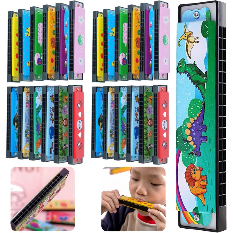 1.Small Size: 5.1"L x 1.1"W x 0.8"H, easy to hold and carry. 2.Package contents: 24Pack kids harmonica for Party Favors. Colors and patterns are randomly sent and will vary or repeat. 3.16-hole Harmonica: easy to play with more tones, suitable for beginners of kids and adults 4.Safe materials for kids: Non-toxic food grade ABS and mental, light and smooth with no sharp edges. The comb is comfortable on the lips. 5.Bright color and Attractive patterns: Harmonica with cartoon patterns including dinosaurs, animals, insects, etc... cute and attractive for children of ages 3+. 6.Best party favors -birthday party favors for kids goodie bags, holiday party game, family day, stage performances, classroom teaching, student motivation and travel relax. 7.Musical Instrument Toy - This toy harmonica is Non-professional. But its voice is sweet and pure. Our harmonicas are not just a toy, they are learning instrument toys to cultivate children's music interest.