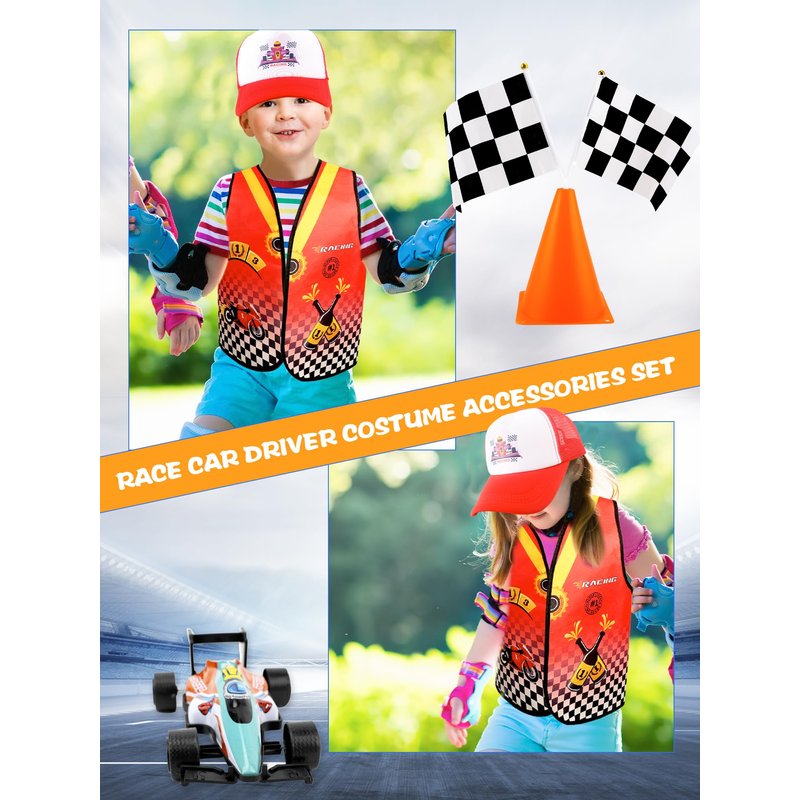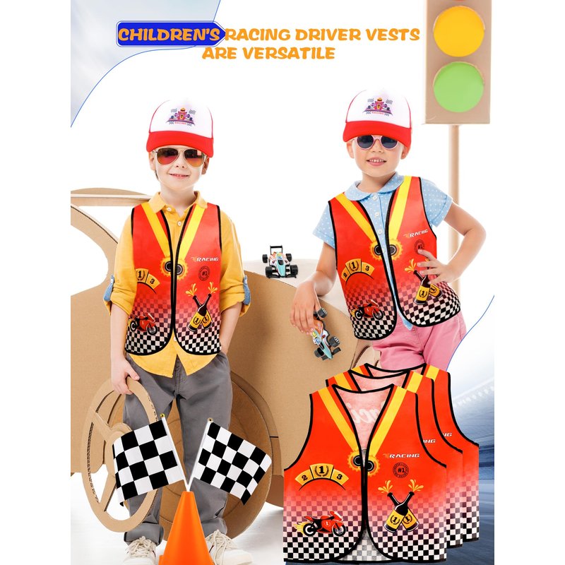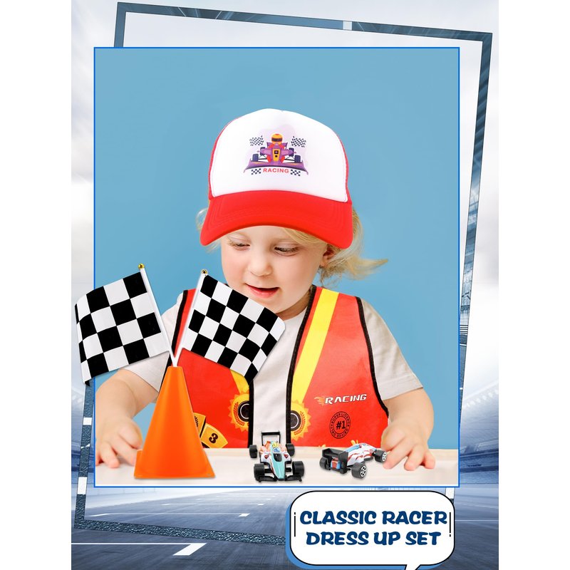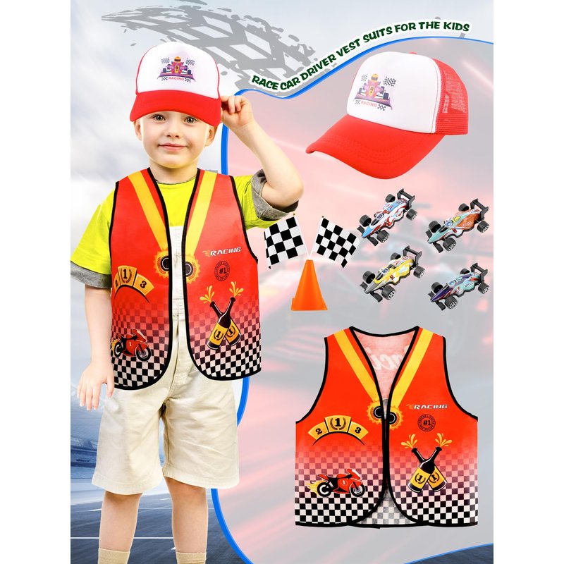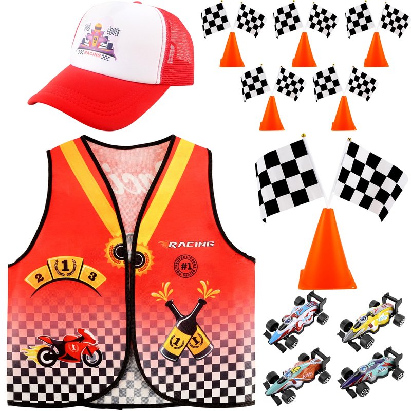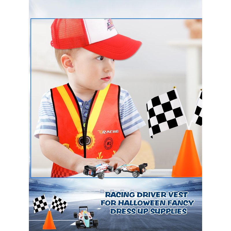 - 【What You Can Get】: You will receive a 24-piece racer costume kit including 1 vest, 1 logo car cap, 4 pull back cars toy model set, 12 flags, and 6 traffic cones, which is enough for you to choose your favorite profession and dress up to meet your role-playing needs in career theme parties, class activities, school performances, etc