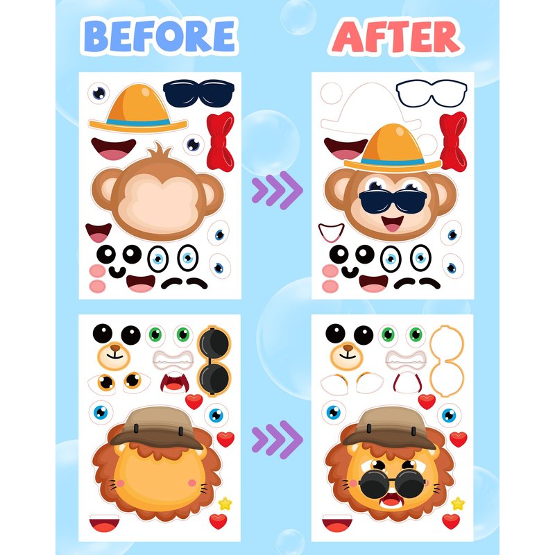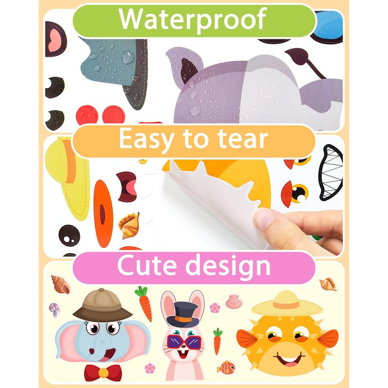 - PREMIUM QUALITY: All face stickers are made of high quality paper material, which is safe and non-toxic, waterproof. 100% brand new high-definition printing, the patterns are more precise and clear. Each animal face sticker for kids is perfectly cut according to the shape and size, which can be used directly. These sticker sheets can be stuck on repeatedly and the adhesive can be torn off without any residues.