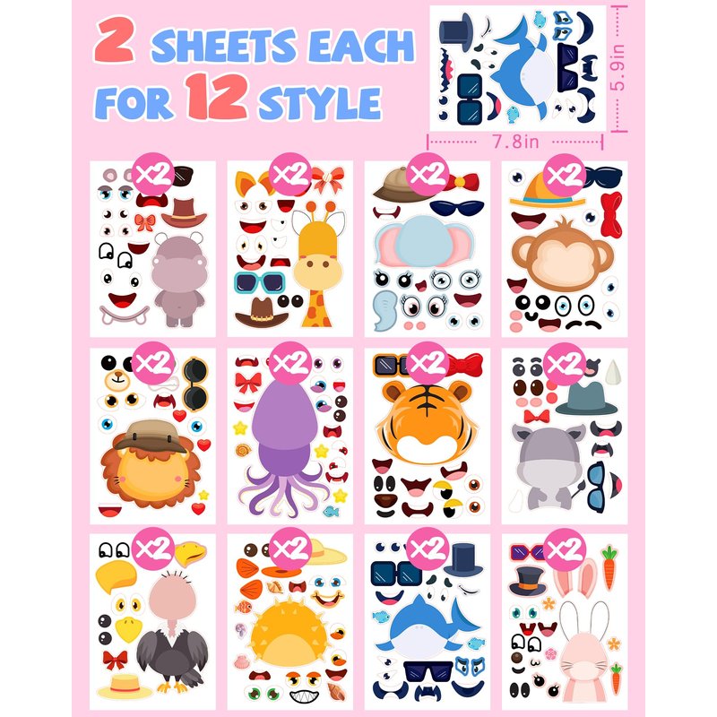 - 24 MAKE YOUR OWN STICKERS: 2 sheets animal stickers include lion, monkey, elephant, deer, sea animals and more, total of 12 different styles, and each style has 2 sheets to fulfill your decorating needs. 7.8 inches × 5.9 inches per sheet. Large size makes it easier for kids to operate.