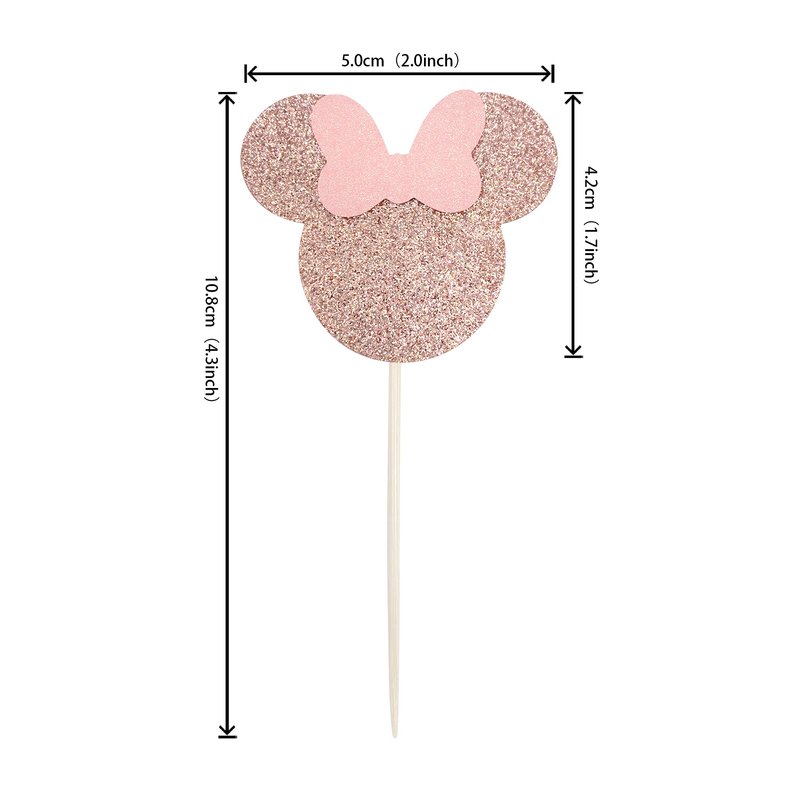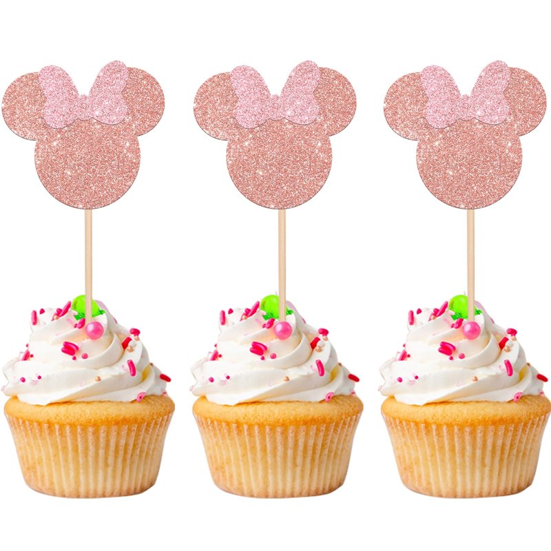 24 PCS Mouse Inspired Cupcake Toppers with Pink Bow Rose Gold Glitter Mini Cupcake Picks Decorations for Baby Shower Wedding Kids Birthday Party Supplies