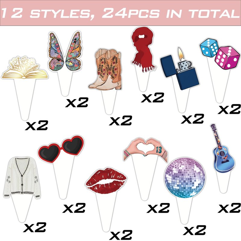 - package includes: the popular happy birthday era's party decorations contain 24 pc 2.75 inch music themed cupcake toppers. 12 unique designs of super star cake decorations for cakes, ice cream, cheese, and any other dessert dish. using our era's birthday cake topper to decorate your party food and make them look more delicious, which is a best choice for big fans