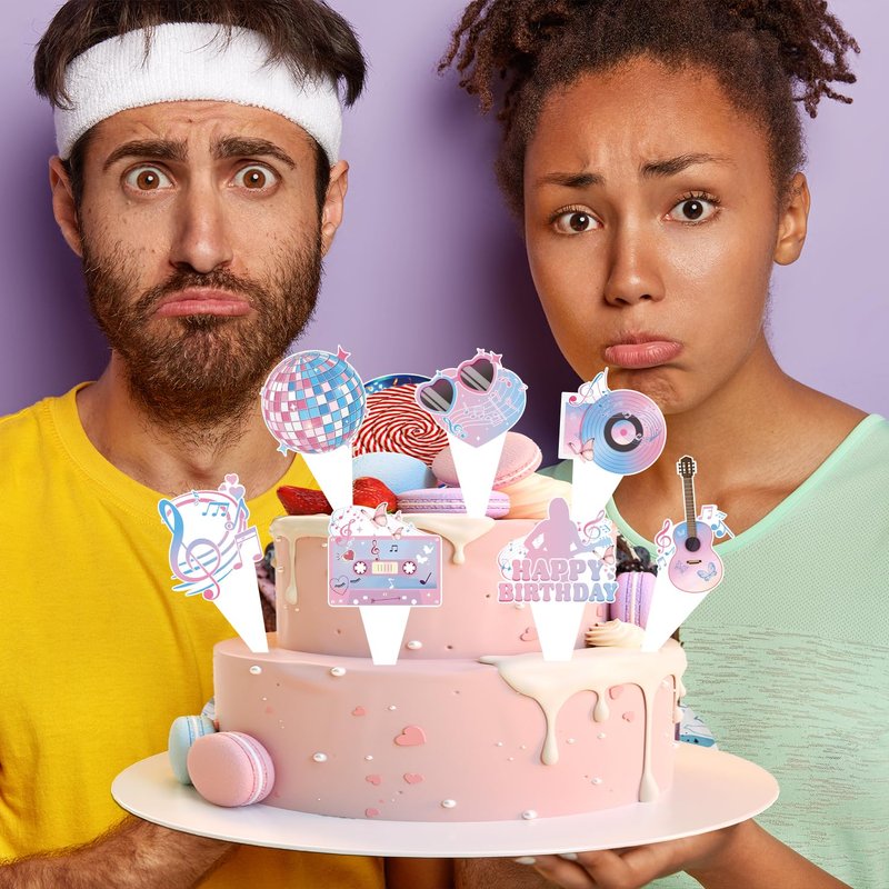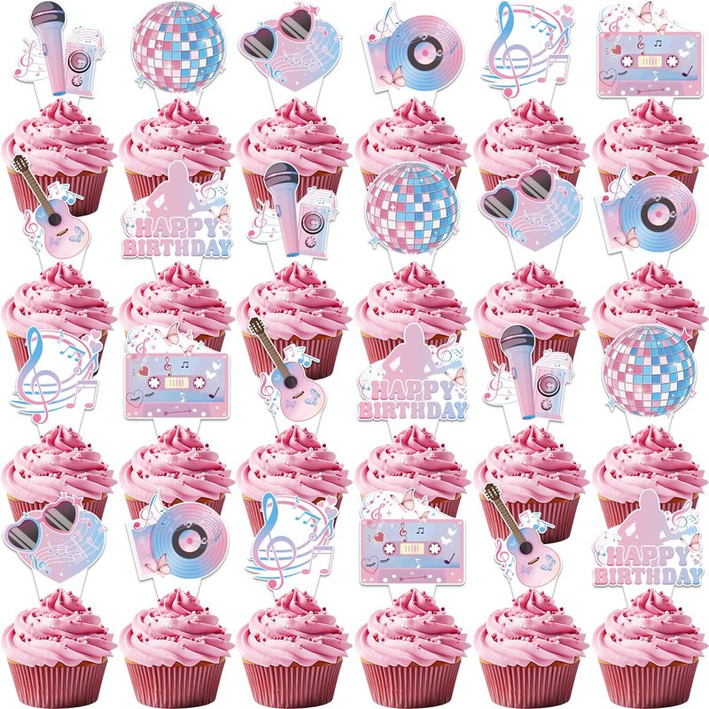 - package includes: the popular happy birthday era's party decorations contain 24 pc 3 inch music themed cupcake toppers. 8 unique designs of super star cake decorations for cakes, ice cream, cheese, and any other dessert dish. using our era's birthday cake topper to decorate your party food and make them look more delicious, which is a best choice for big fans