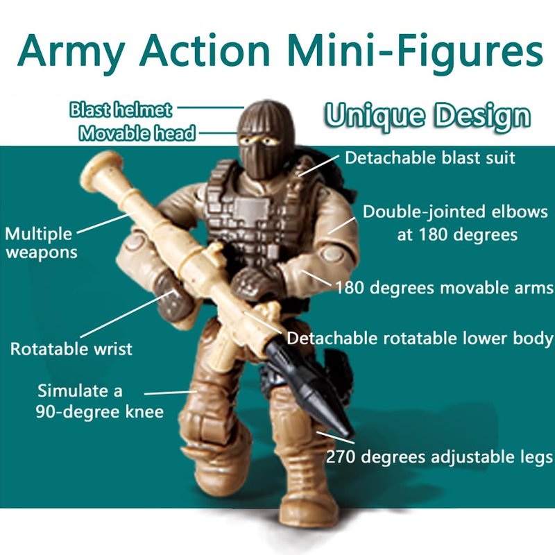 - 【High Playability Mini Soldiers】SWAT combat soldier action figures have excellent quality and very good details, such like armed military belt, helmet, ammo pack, bulletproof vest, etc. The more important is movable joints. Every army men can be bend, sit, stand, turn their heads, move their arms and legs.